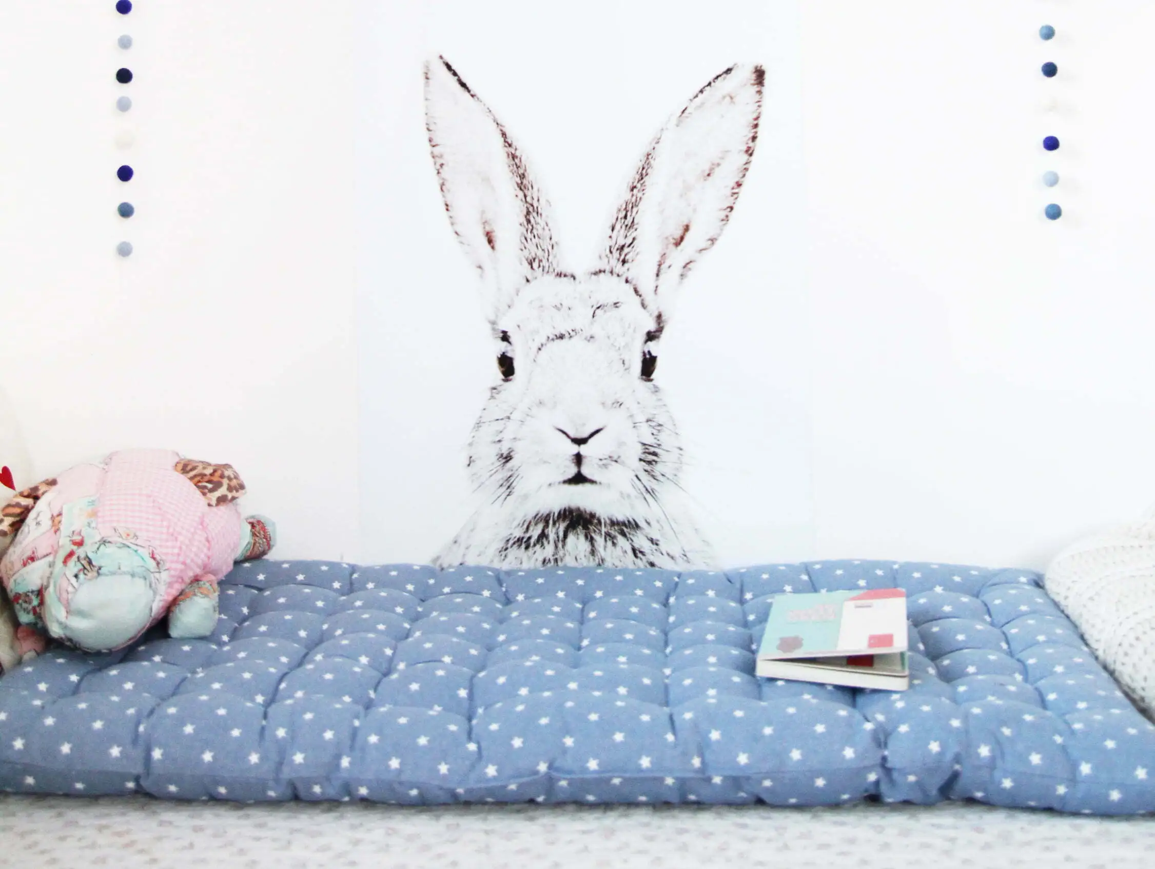 Um den Bereich optisch zu begrenzen, habe ich den Hasen mit einer Pom-Pom-Kette aus Filzkugeln „gekrönt“, Die Kette ist schnell gemacht: Einfach die Kugeln mit einer Nähnadel im gewünschten Abstand auf einen Faden ziehen – tolle Filzkugeln gibt es hier, da der amerikanische Shop jedoch so hohe Versandkosten hat, habe ich mich für diese hier entschieden