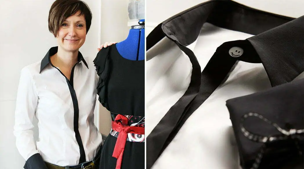 Meine Bluse im Detail mit schwarzem Kragen und Knopfleiste und – jawohl – einem Smiley-Knopf, um die strenge Gestaltung ein wenig zu brechen
