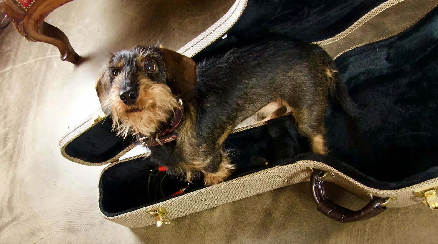Frauchen hat im letzten Jahr wirklich jede kulturelle Gelegenheit genutzt, die sich ergab. Ihr Highlight war eine Wohnzimmerprobe ihrer Lieblingsband, den Sazerac Swingers bei uns zu Hause. Praktischerweise kommt diese aus Gütersloh und ist eine der besten europäischen Bands, die den aktuellen jungen New Orleans Jazz spielen. Frauchen sagt, dass die Konzerte total toll wären und jedes Mal die Bude bebt. Also ehrlich gesagt, hatten wir ganz schön Angst davor, dass unser Haus rappelt. Aber: Die Bandprobe war super! Das fing schon mit dem Instrumentenaufbau an: So viele Kästen, in denen wir rumschnuppern konnten. Kalle hatte es vor allem der Gitarrenkasten von unserem neuen Freund Max, dem Bandleader, angetan. Und alle waren so nett zu uns. Ständig wurden wir gestreichelt und gelobt.