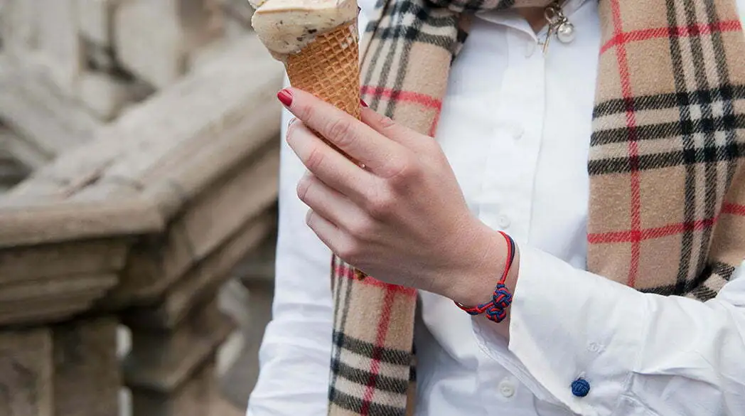 Ich trage dazu eine Bluse von Eterna, einen Schal von Burberry und eine Sonnenbrille von Tiffany und Co. Und nicht zu vergessen: Mein unglaublich leckeres, erstes Eis in diesem Jahr!