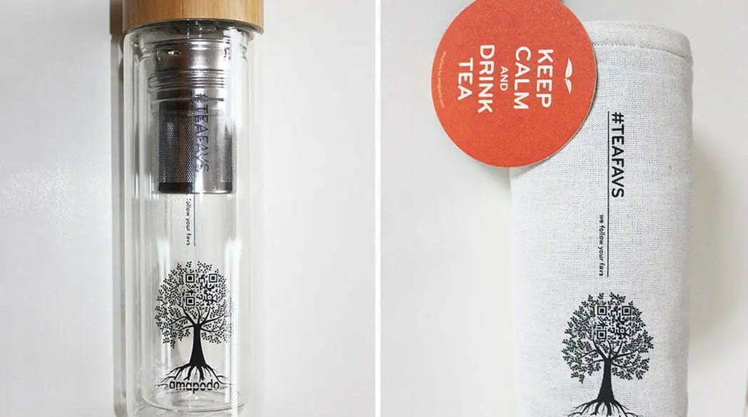 Die #TEAFAVS werden über den Onlineshop amapodo.de vertrieben, welcher 2014 von Michél Walther gegründet wurde. Die Thermo-Teegläser gehören zu den ersten selbstentwickelten Produkten der Seite. Sie bestehen aus einem doppelwandigen Borosilikatglas mit einem Fassungsvermögen von 450 ml. Versehen ist das Glas mit einem Schriftzug und dem Logo von amapodo – einem Baum, in dem sich ein QR-Code versteckt. Der Verschluss des Deckels besteht aus BPA-freiem Silikon. Das Teesieb, welches durch Einrasten fest in dem Glas hängt, besteht aus zwei Teilen. Durch einen Schraubverschluss lässt sich der untere Teil lösen, so dass der Tee auch lose in das Glas gefüllt werden kann. Da das Teeglas den Inhalt bis zu zwei Stunden warm hält, kann es auch als Begleiter für unterwegs genutzt werden – Tea to go!