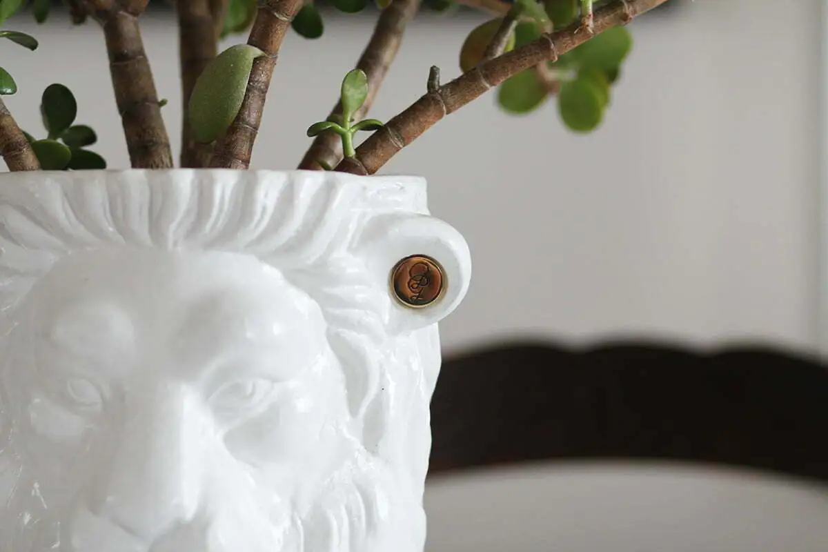 Der weiße Löwenkopf-Topf passt perfekt in unser Wohnzimmer mit seinen antiken Möbeln
