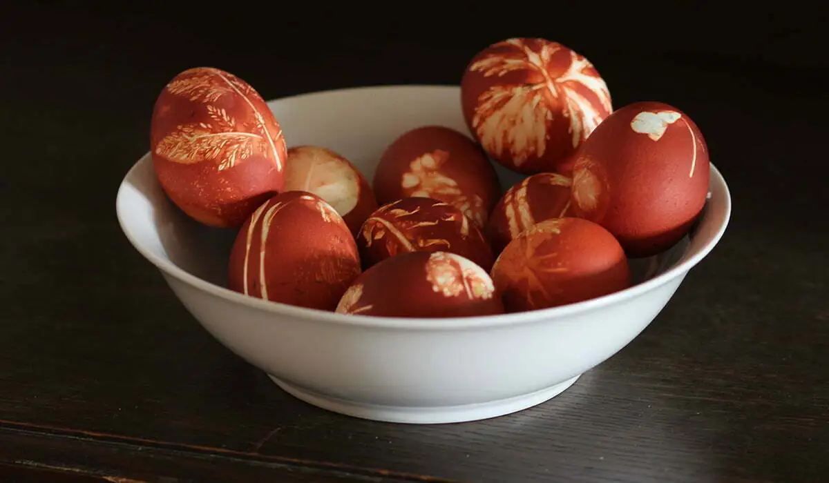 Wir färben unsere Eier mit natürlichen Farben, z.B. mit Zwiebelschalen – das hübsche Muster entsteht durch Kräuter die mit Hilfe einer Strumpfhose auf dem Ei angebracht und im Zwiebelsud mitgekocht werden
