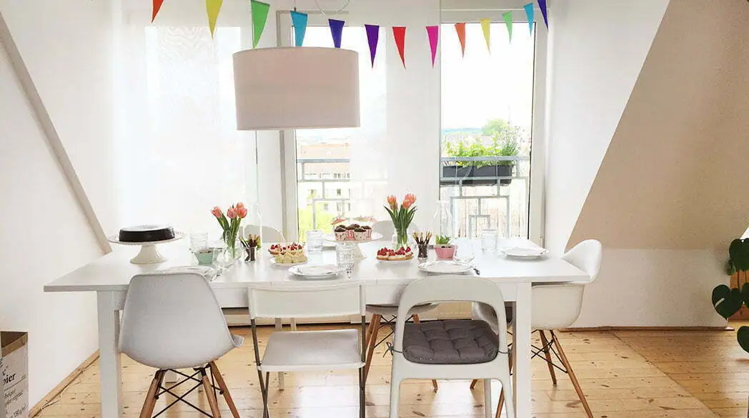 Mein Einrichtungsstil ist relativ klar und hell. Ich liebe weiße Möbel, die vor allem die Holzbalken und den alten Dielenboden frischer aussehen lassen. Zusätzliche Holzmöbel würde unsere Wohnung „erschlagen“.