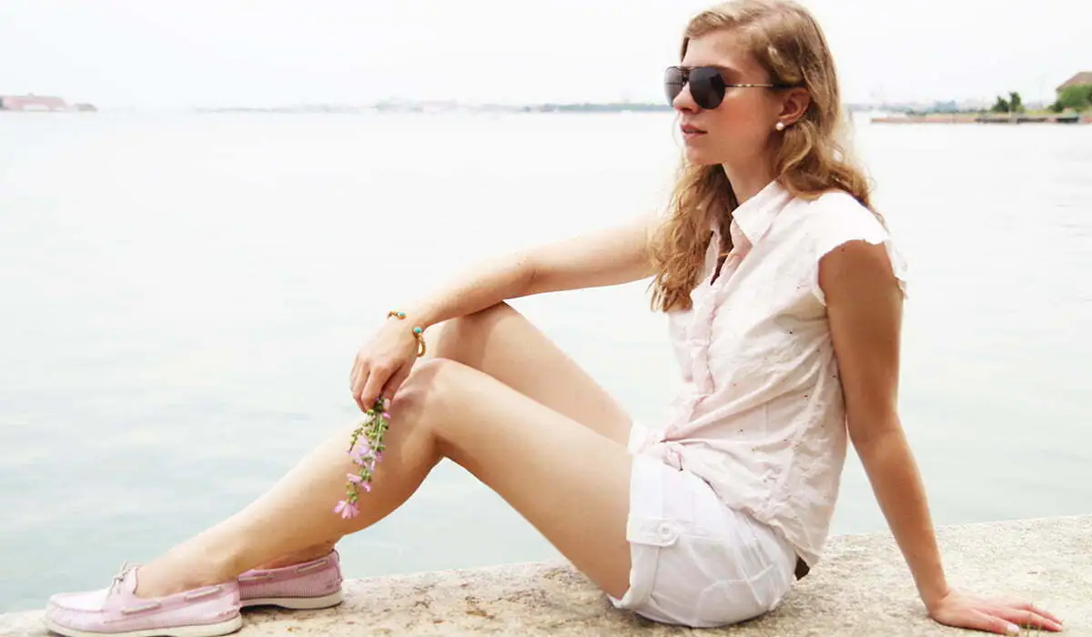 Letzte Woche ging es für mich und meinen Liebsten auf einen Trip nach Venedig und die umliegenden Inseln – in nächster Zeit erhaltet Ihr hier deshalb noch so einige Ausflugstipps und Impressionen von diesem tollen Kurzurlaub. Los geht’s heute aber erst einmal mit einem Outfitpost, den wir auf Lido geschossen haben. Die Ferieninsel mit ihren kilometerlangen Stränden, kleinen Brücken und verschlafenen Orten lässt sich am besten mit einem Rad erkunden. Viele Hotels verleihen Räder für wenig Geld oder stellen sie sogar kostenlos zur Verfügung. Für die Umrundung der Insel habe ich ein bequemes Preppy-Outfit gewählt: Shorts, eine leichte Bluse und meine neuen Sperry Top-Sider – alles in hellen Rosé-Tönen gehalten.