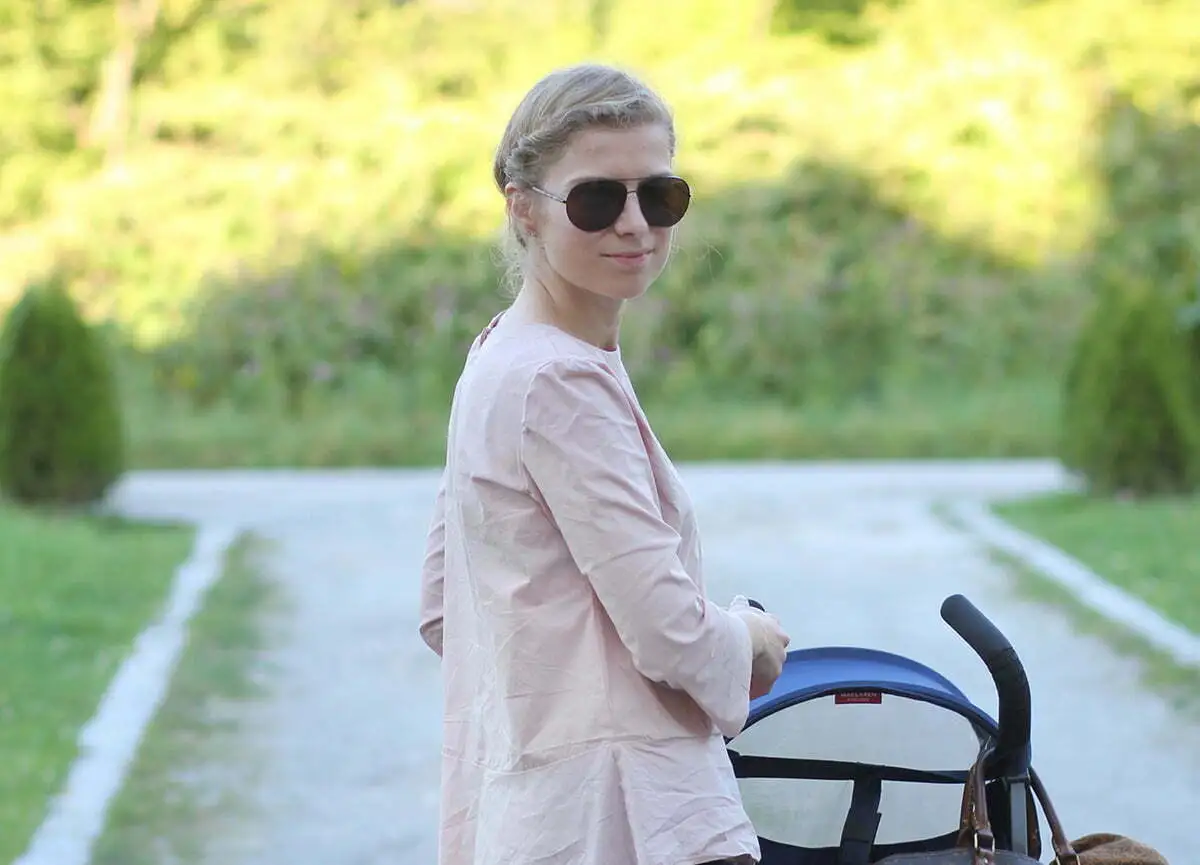 Für unseren Spaziergang mit dem MacLaren trage ich heute meine Ralph-Lauren-Reiterhose zu einem selbstgenähten, zart roséfarbenen Seidenshirt