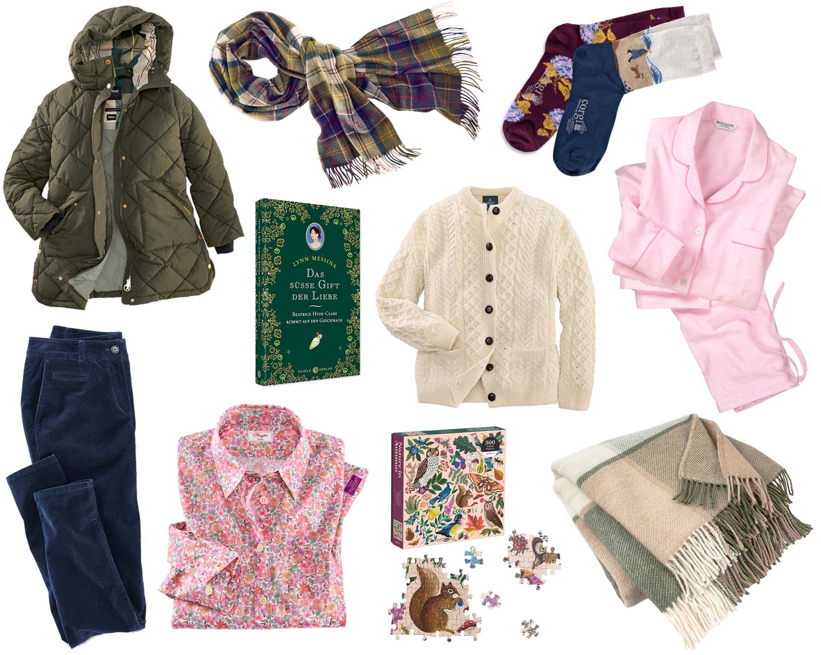 Der Herbst ruft natürlich nicht nur nach entspannten Spaziergängen im goldenen Herbstlaub, sondern auch nach jeder Menge Gemütlichkeit daheim – und die haben wir uns nach den häufig doch sehr vollgepackten Sommermonaten auch redlich verdient. So richtig muggelig wird’s zum Beispiel mit dem Flanell-Pyjama im Hahnentritt-Check und mit pinkfarbener Paspel vom englischen Traditionsunternehmen Bonsoir. Die leicht aufgeraute Baumwolle in Rosa und Weiß fühlt sich herrlich weich an und wärmt angenehm. Und dazu: Die Corgi-Socken Hortensia oder Seaside – ich bin in jeder Saison wieder ganz entzückt von den Motiven. Besonders das Spaziergang-am-Meer-Motiv ist total meins. Für den ultimativen Hygge-Moment fehlt nur noch das luxuriöse Schurwoll-Plaid Forest Meadow mit großem grünen Karomuster und ein Buch oder ein Puzzle! Wie wäre es mit dem Herbstlichen Puzzle Nature in Autumn mit farbenfrohen Tier- und Pflanzenmotiven oder dem Roman von Lynn Messina Das süße Gift der Liebe? Den ersten Teil der viktorianischen Krimi-Reihe rund um Miss Beatrice Hyde-Clare haben wir Euch hier bereits empfohlen.