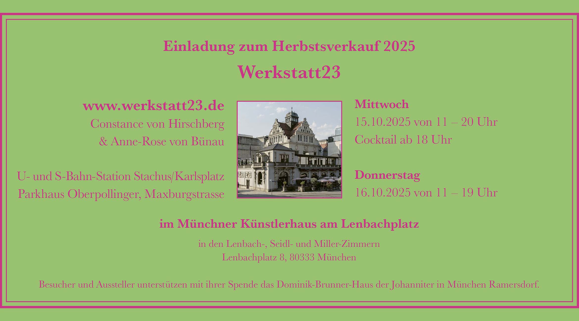 Am Mittwoch, 15. Oktober (11-20 Uhr, ab 18 Uhr Cocktails) und am Donnerstag, 16. Oktober 2025 (11-19 Uhr) laden Anne-Rose v. Bünau und Constance v. Hirschberg wieder in das Münchner Künstlerhaus am Lenbachplatz, in die Lenbach-, Seidl- und Miller-Zimmer zum beliebten Herbstverkauf der Werkstatt 23. Mit dabei sind u.a. Hirschwerk, Pelina Bijoux und The Salonette.