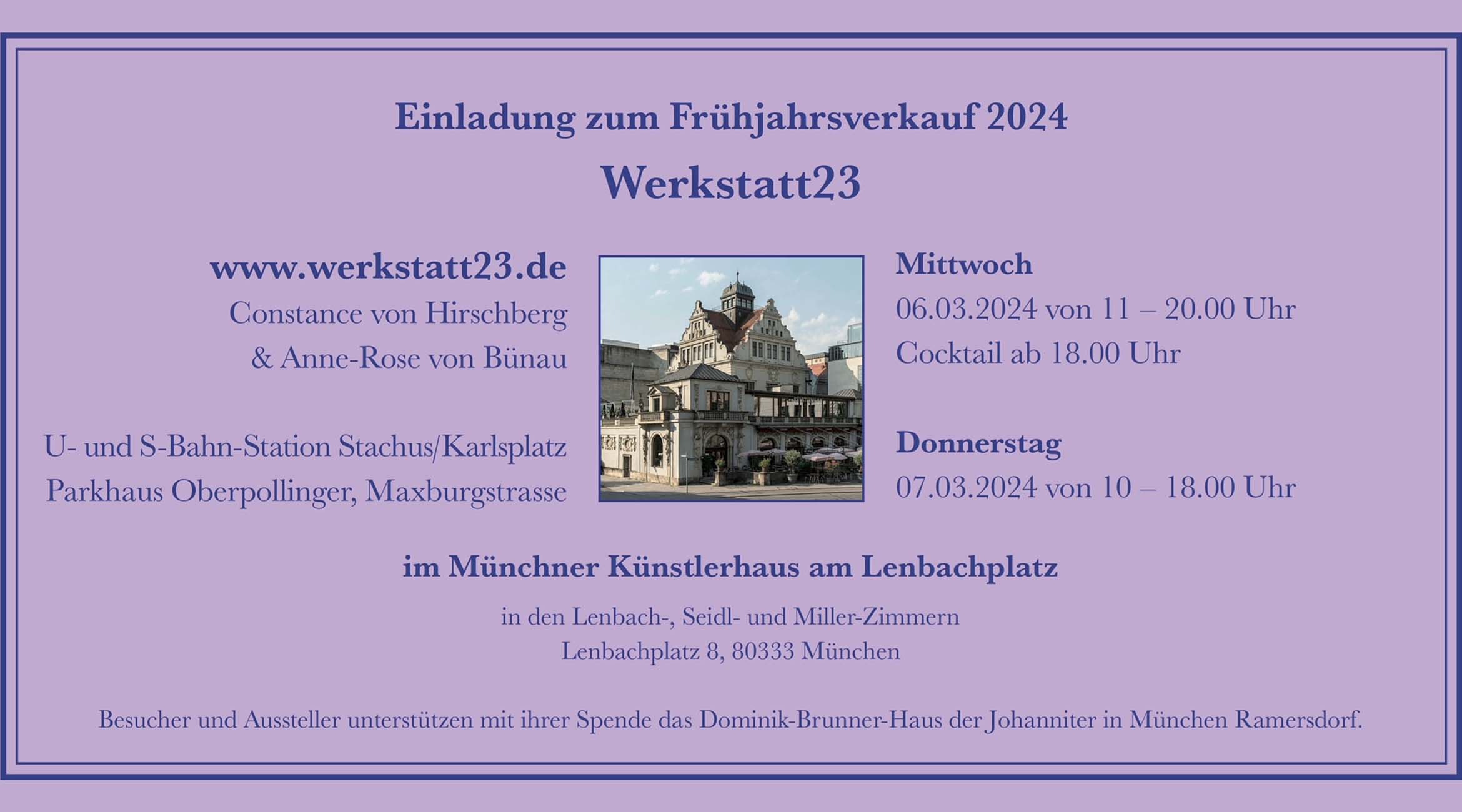 Am Mittwoch, 06. März (11-20 Uhr, ab 18 Uhr Cocktails) und am Donnerstag, 07. März 2024 (10-18 Uhr) laden Anne-Rose v. Bünau und Constance v. Hirschberg wieder in das Münchner Künstlerhaus am Lenbachplatz, in die Lenbach-, Seidl- und Miller-Zimmer zum beliebten Frühjahrsverkauf der Werkstatt 23. Mit dabei sind u.a. Rabe v. Pappenheim und Malaika.