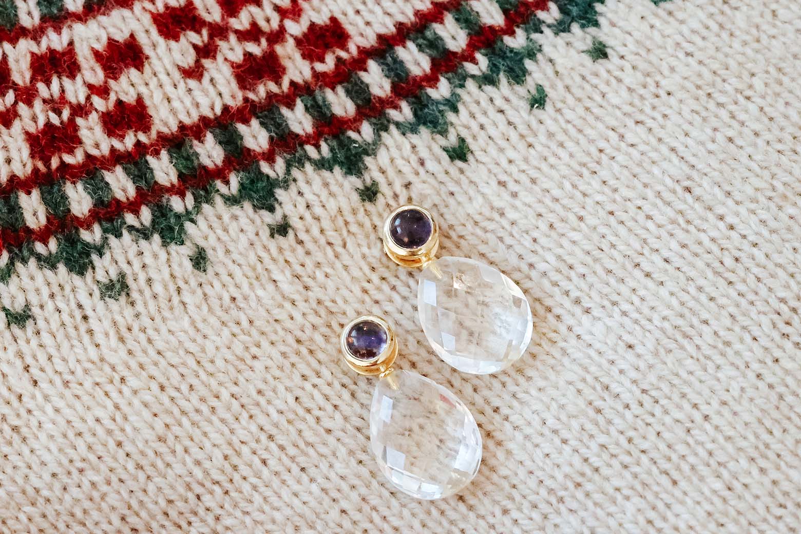 5. Funkelohrringe von Carlchen B.: Ein bisschen Glitzer darf natürlich auch nicht fehlen! Am Heiligabend werde ich dieses Jahr wieder funkelnde Ohrringe der smarten Mix & Match Kollektion von Carlchen B. ausführen: Stecker aus violettem Iolith treffen auf einen transparentem Bergkristall-Unterhänger! Gründerin Kathi Stegmann hat mir den Stecker empfohlen, und obwohl ich selbst wohl nie zu dieser Farbe gegriffen hätte, bin ich nun umso begeisterter – so elegant und vielseitig! Der große Bergkristall in Birnenform scheint je nach Lichteinfall regelrecht Funken zu sprühen und erinnert mich ein wenig an gefrorenes Eis und glitzrige Weihnachtsbeleuchtung. Auch perfekt für den Winter!