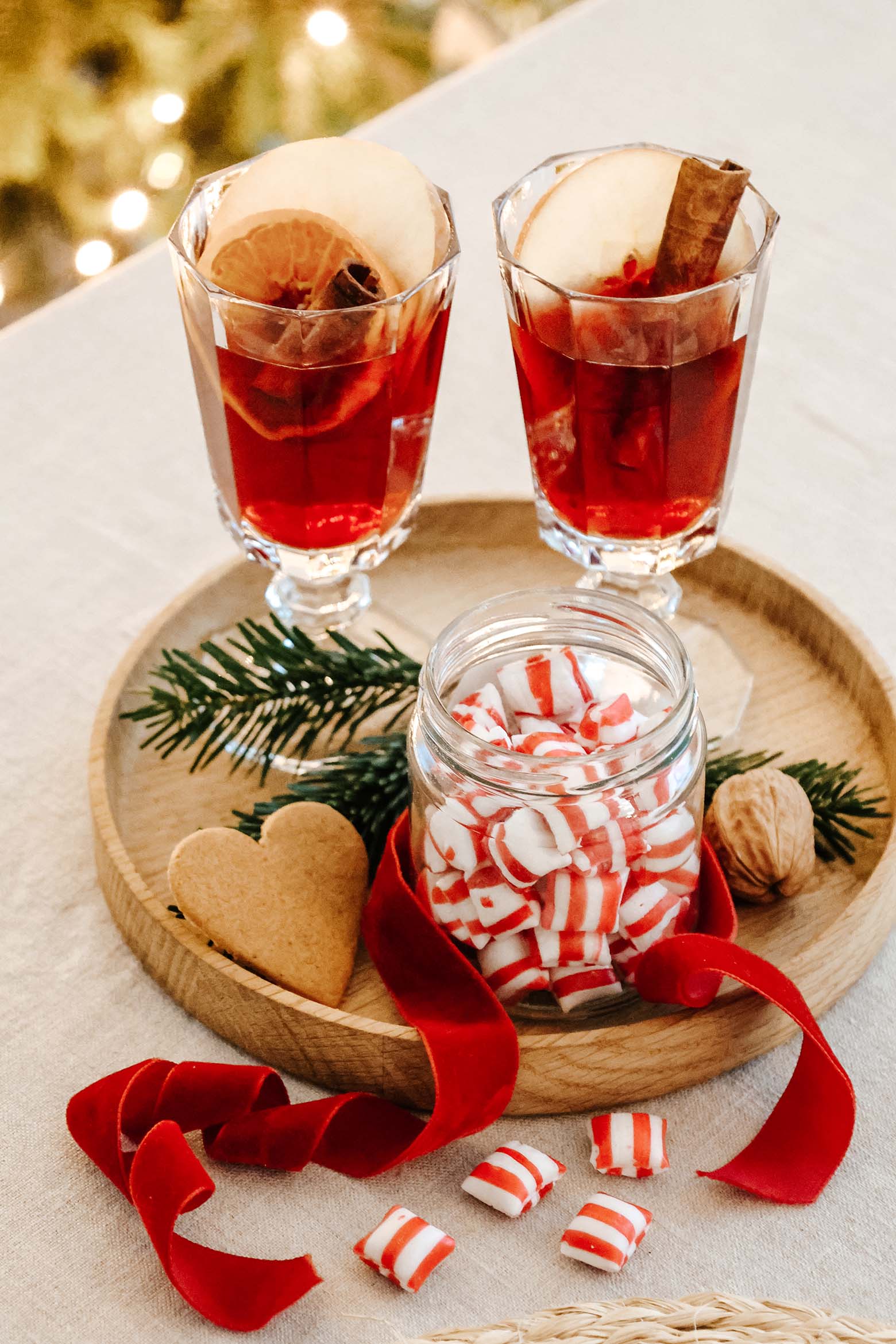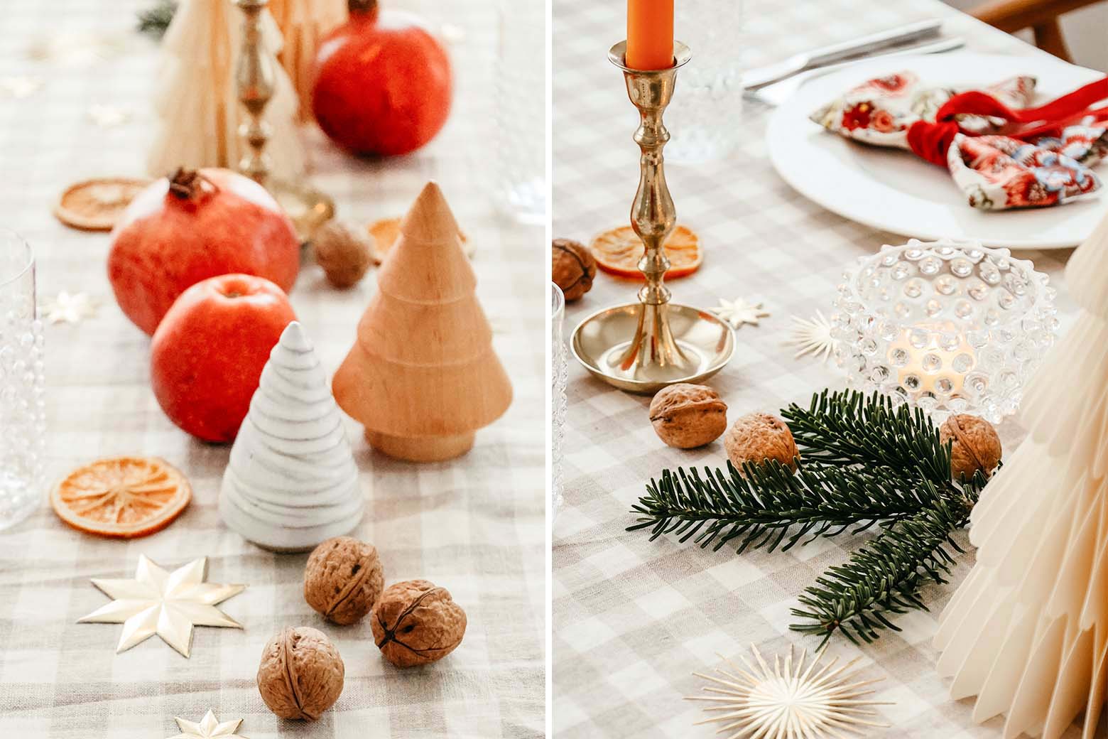 1. Meine schwedische Weihnachtstafel: Mein schwedisches Weihnachtsgeschirr „Swedish Grace Winter“ von Rörstrand habe ich Euch ja bereits Anfang des Jahres gezeigt. Mittlerweile habe ich mein Service komplettiert und erfreue mich nun jeden Tag an dem herrlich winterlichen Geschirr. Für die Weihnachtstafel nutze ich meine seit Jahren geliebte sand-karierte Leinentischdecke von The Salonette Collection kombiniert mit rot-grün gemusterten Blockprint-Servietten, Noppengläsern, weihnachtsroten Samtschleifen, cremefarbenen Faltbäumchen und goldenen Dresdner Pappen. Dazu kommen schlichtes weißes Porzellan, Silberbesteck, Messingleuchter vom Loppis, kleine Bäumchen aus Holz sowie natürliche Deko wie getrocknete Orangenscheiben, Granatäpfel, Nüsse und Tannenzweige auf den Tisch.