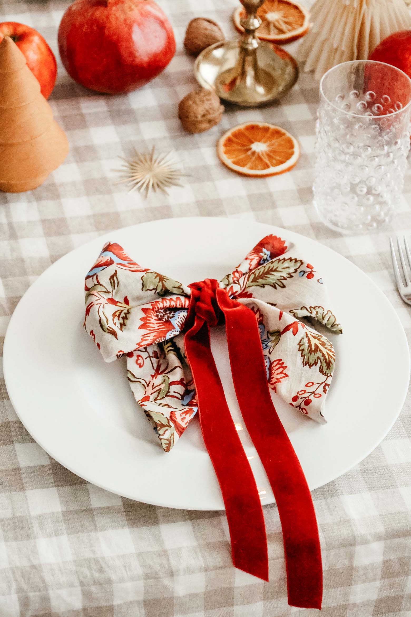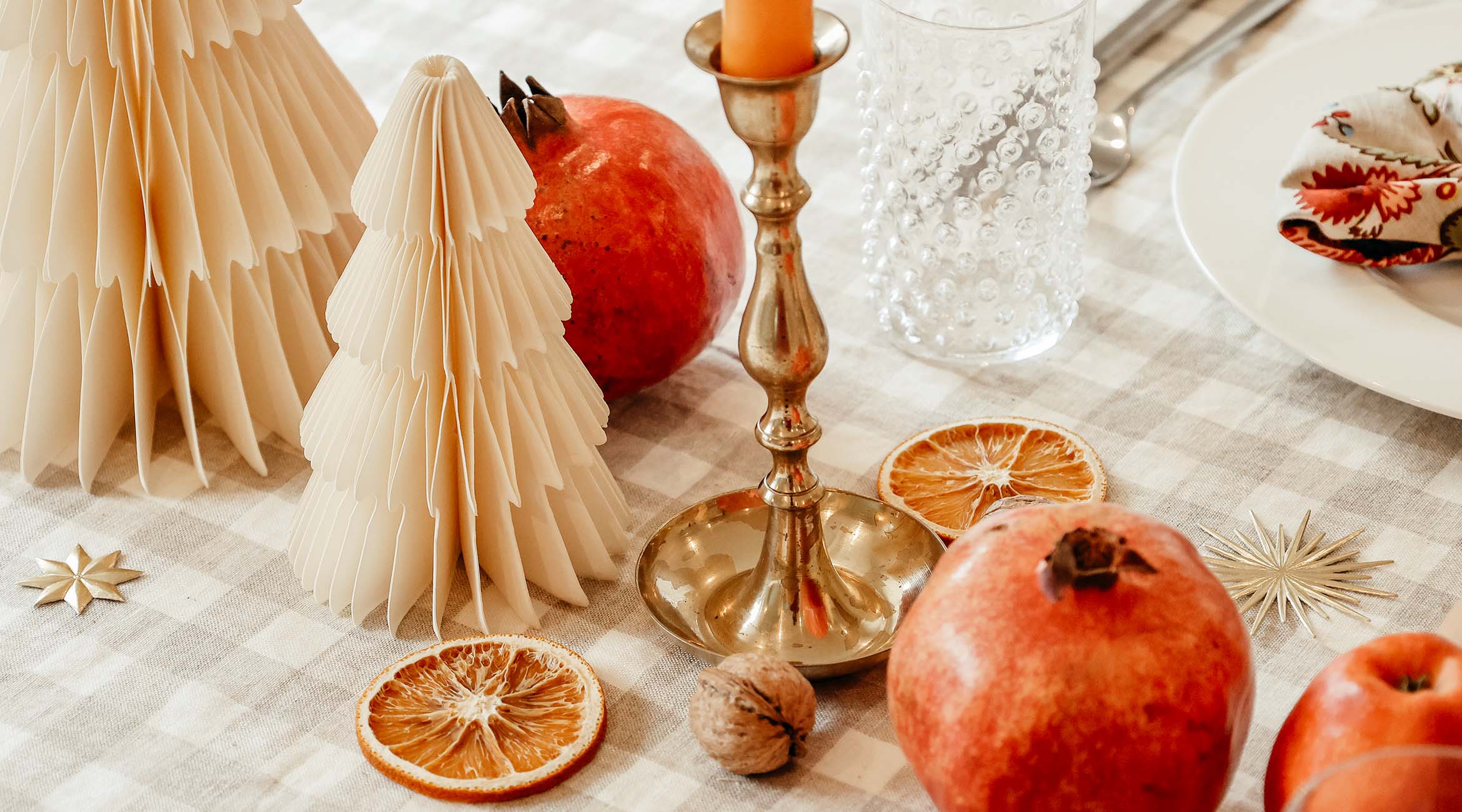 1. Meine schwedische Weihnachtstafel: Mein schwedisches Weihnachtsgeschirr „Swedish Grace Winter“ von Rörstrand habe ich Euch ja bereits Anfang des Jahres gezeigt. Mittlerweile habe ich mein Service komplettiert und erfreue mich nun jeden Tag an dem herrlich winterlichen Geschirr. Für die Weihnachtstafel nutze ich meine seit Jahren geliebte sand-karierte Leinentischdecke von The Salonette Collection kombiniert mit rot-grün gemusterten Blockprint-Servietten, Noppengläsern, weihnachtsroten Samtschleifen, cremefarbenen Faltbäumchen und goldenen Dresdner Pappen. Dazu kommen schlichtes weißes Porzellan, Silberbesteck, Messingleuchter vom Loppis, kleine Bäumchen aus Holz sowie natürliche Deko wie getrocknete Orangenscheiben, Granatäpfel, Nüsse und Tannenzweige auf den Tisch.